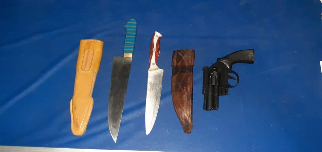 No mesmo local, se encontrava o envolvido 02, com um simulacro de arma de fogo (revólver) e uma faca peixeira 7 polegadas. Diante dos fatos conduziram os imputados para a DPC local, para serem tomadas as medidas cabíveis.