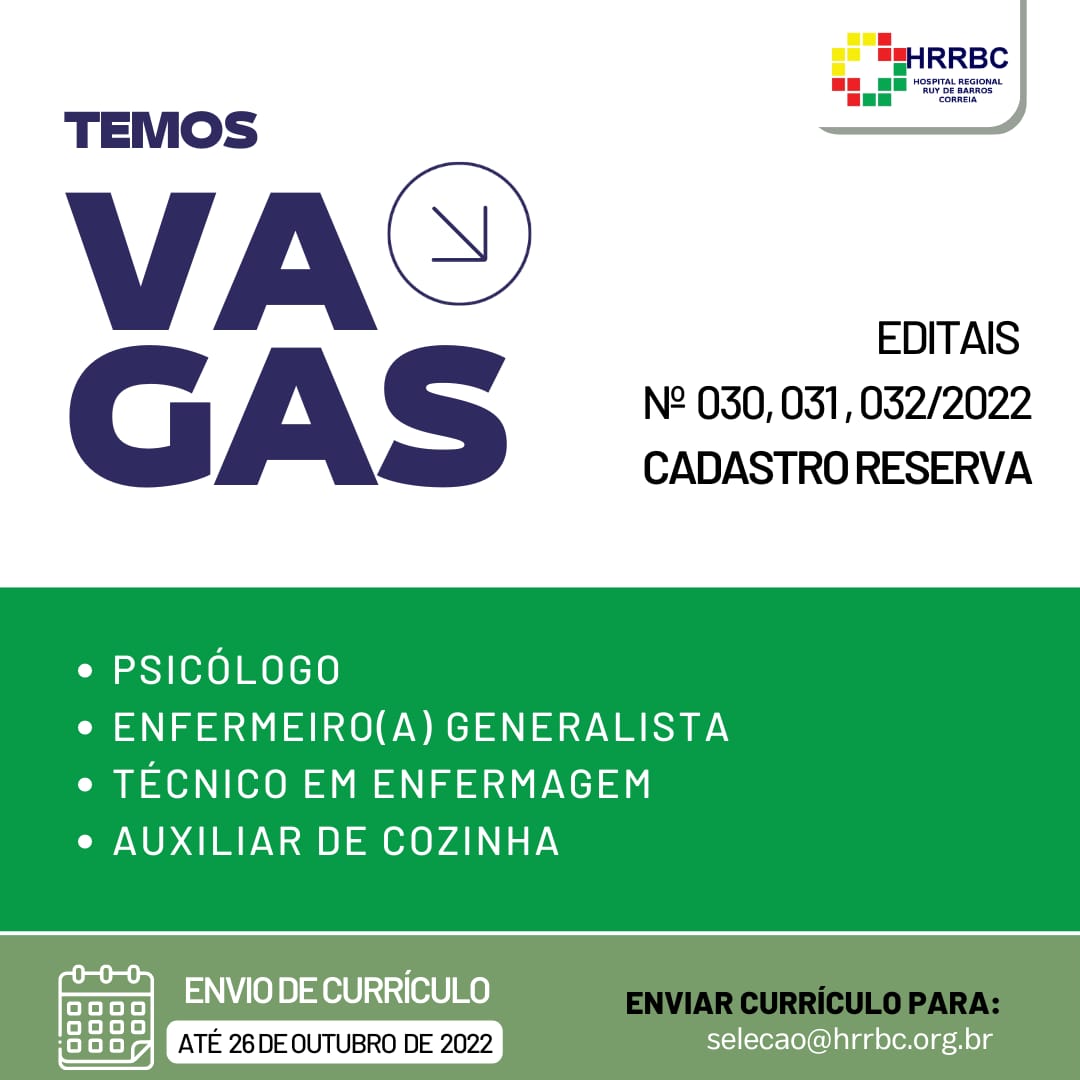 Os interessados devem encaminhar seus currículos, constando o nome completo do candidato e a função pleiteada para o e-mail selecao@hrrbc.org.br até o dia 26 de outubro de 2022, atendendo todas as disposições previstas nos editais que se encontram no site do HRRBC.