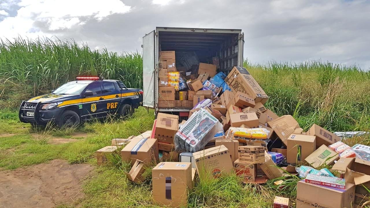 A Central da PRF recebeu informações de que um caminhão havia sido roubado e acionou uma equipe para localizar o veículo. Ao chegarem em um canavial próximo da rodovia, os policias localizaram o veículo com diversas mercadorias espalhadas.