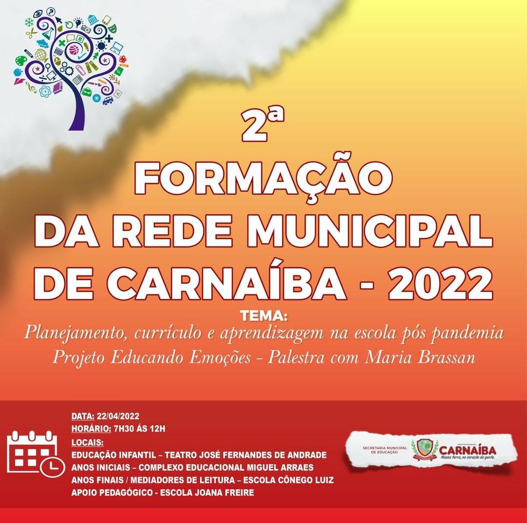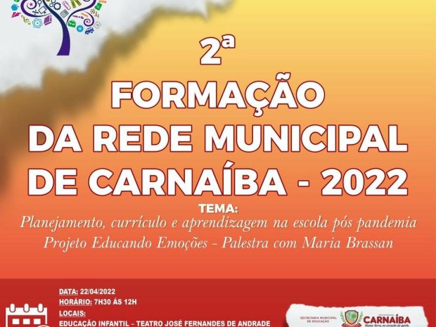 Nesta quarta-feira (13), a Prefeitura de Carnaíba anunciou que na próxima semana, após o feriado, dia 22/04, a Secretaria de Educação realiza a 2ª formação para a Rede Municipal de Ensino, incluindo professores, mediadores de leitura e apoio pedagógico.