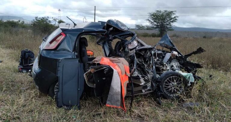 Segundo a Polícia Rodoviária Federal (PRF), o carro modelo Fiat Punto entrou na contramão e foi atingido por um caminhão. Nas imagens é possível ver como o automóvel ficou destruído após a batida.