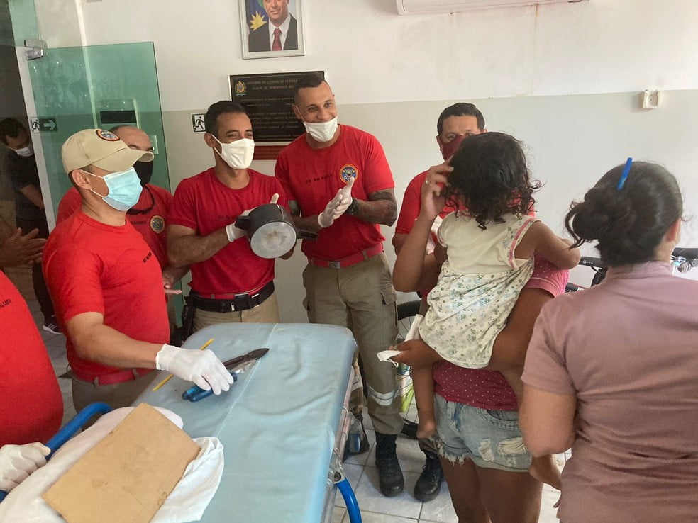Na cidade de Garanhuns, o Corpo de Bombeiros fez o procedimento de retirada da panela da cabeça dela. A criança passa bem e não precisou ficou internada. Com informações do G1