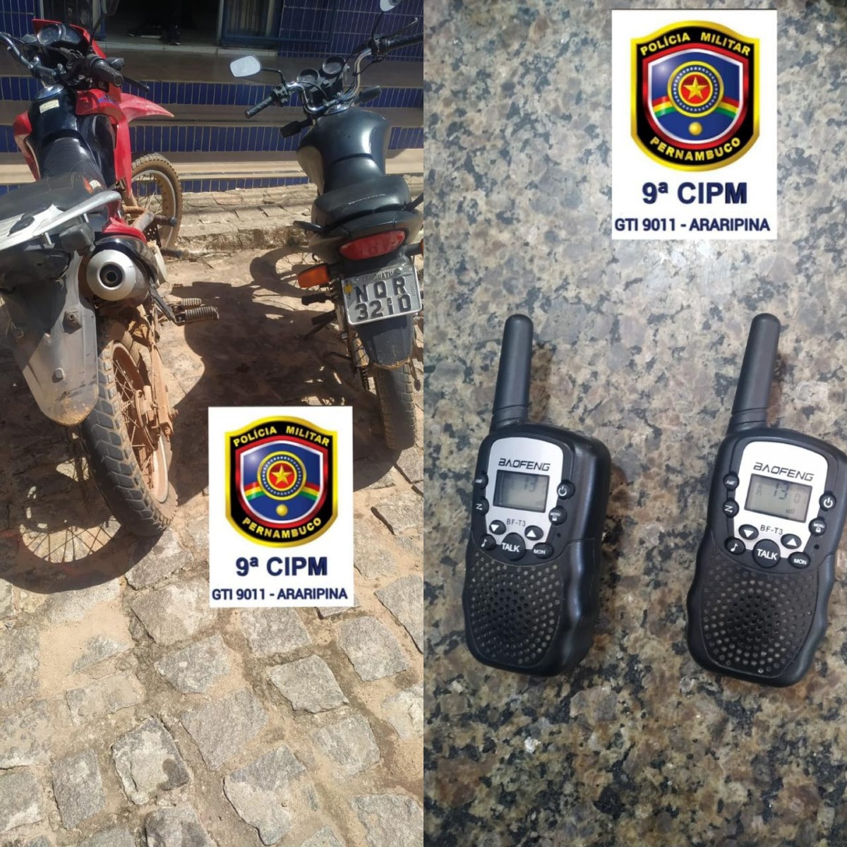 Na delegacia foi verificado que a motocicleta utilizada pelos indivíduos, também era produto de furto. Diante o ocorrido, os acusados, as motocicletas apreendidas e os rádios comunicadores foram encaminhados até a Delegacia de Polícia Civil para adoção das medidas cabíveis. Informações blog Francisco Brito
