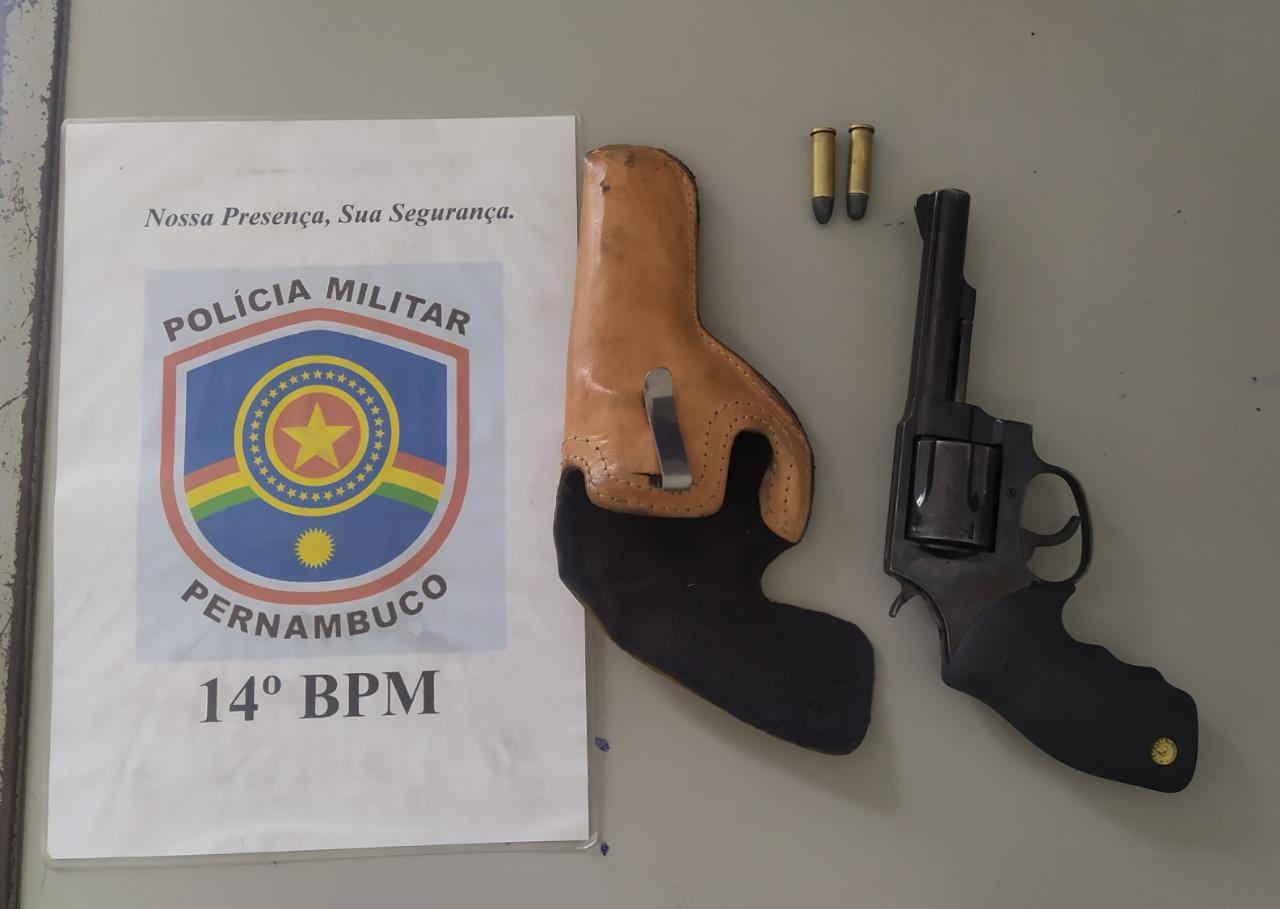 Nesse momento, um indivíduo saiu pela porta dos fundos e empreendeu fuga em direção a caatinga, deixando cair um revólver calibre 38, com duas munições intactas.