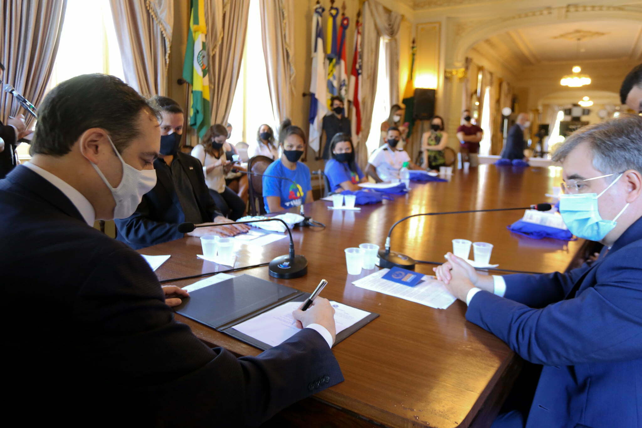 O governador Paulo Câmara recebeu, nesta segunda-feira (12.07), no Palácio do Campo das Princesas, treinadores e paratletas pernambucanos que vão disputar a Paralimpíadas de Tóquio, ainda este ano. No encontro, ele sancionou a lei do Programa Bolsa Técnico e incluiu os treinadores no Programa Passaporte Esportivo Técnico.