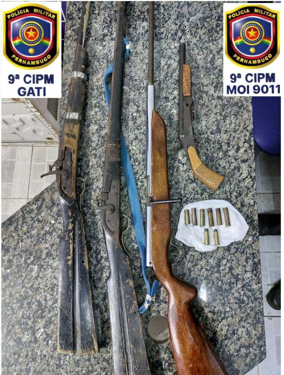 Durante abordagem, os PMs apreenderam 04 espingardas e munições. Os objetos apreendidos foram: 01 Espingarda artesanal cal. 36; 01 Espingarda artesanal cal. 38; 02 Espingardas artesanais tipo soca-soca; 02 Munições cbc intactas cal. 44; 06 Munições recarregáveis cal. 36.
