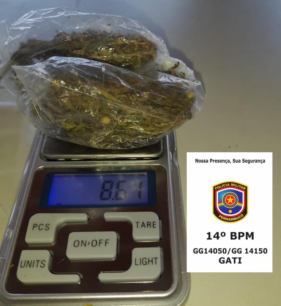 De imediato, foi realizada a revista pessoal, sendo encontrado em seu tênis 02 (dois) invólucros plásticos com substância análoga à maconha, pesando aproximadamente 8,60 gramas.