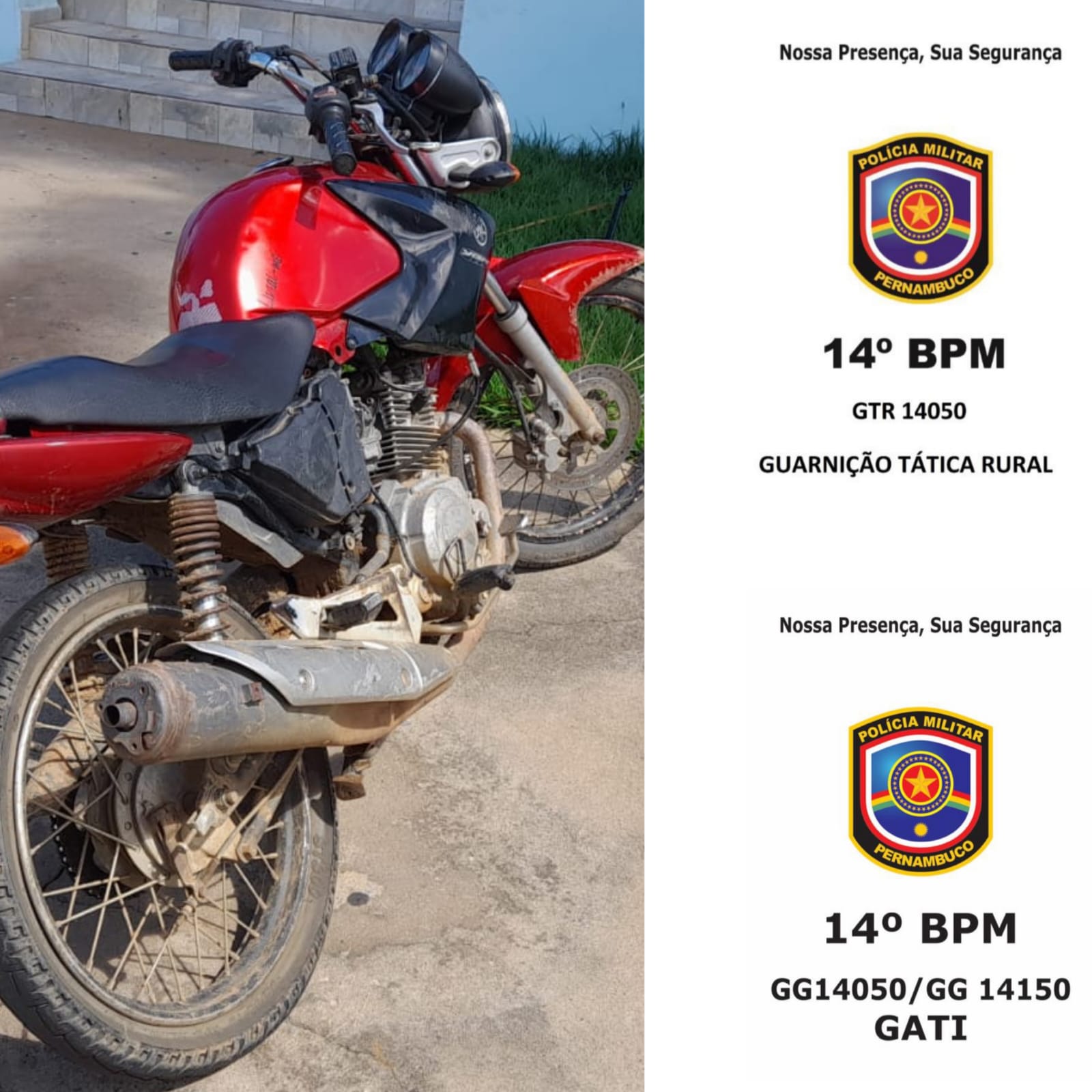 De acordo com informações, Policiais Militares do 14°BPM durante patrulhamento visualizaram dois indivíduos em uma motocicleta, Yamaha/Factor 125, em atitude suspeita.