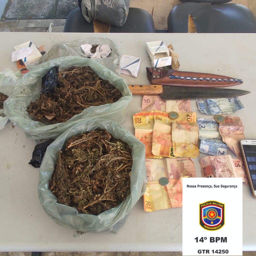 O homem foi detido com aproximadamente 585 gramas de substância análoga à maconha, além da quantia de R$ 127,00 (cento e vinte e sete reais), uma faca peixeira e um aparelho celular SAMSUNG GALAXY J5 PRIME SM-G570F.