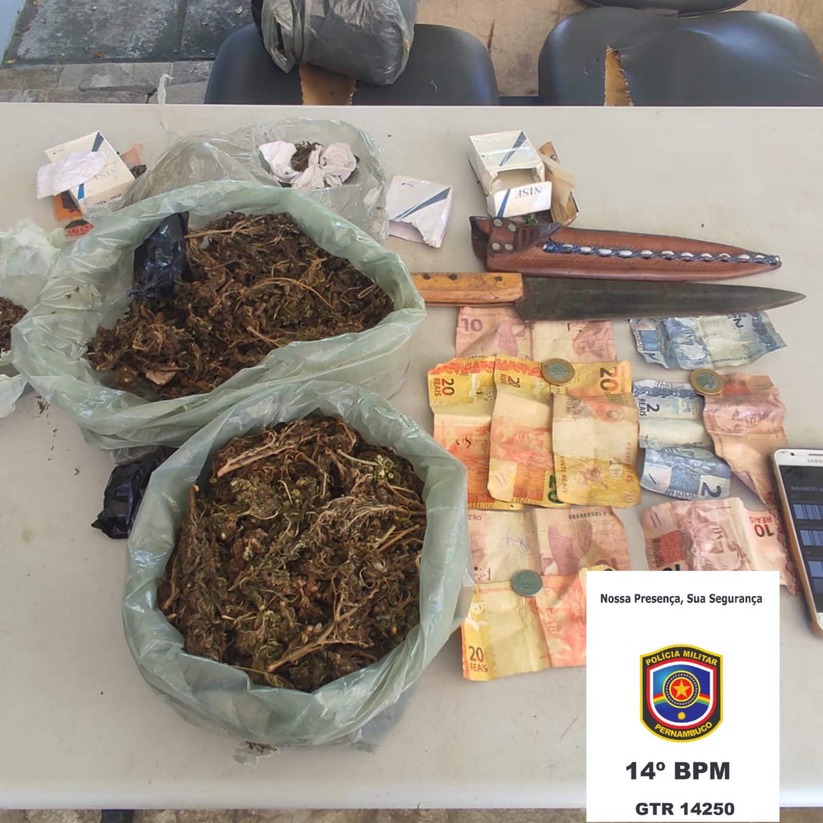 No local, o imputado foi localizado com uma sacola plástica contendo aproximadamente 585 gramas de substância análoga à maconha, além da quantia de R$ 127,00 (cento e vinte e sete reais), uma faca peixeira e um aparelho celular SAMSUNG GALAXY J5 PRIME SM-G570F.