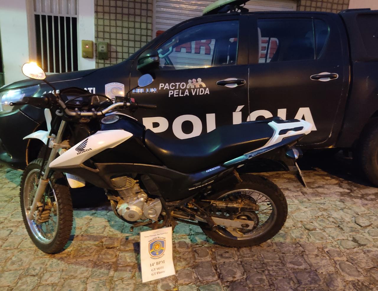 De acordo com as informações, os Policiais Militares do 14°BPM, ao realizarem abordagens no Sítio Araras, fizeram uma consulta, via sistema INFOSEG, no veículo do imputado, no qual foi constatado que a motocicleta HONDA/NXR 160 BROS, de cor branca possuía queixa de roubo.