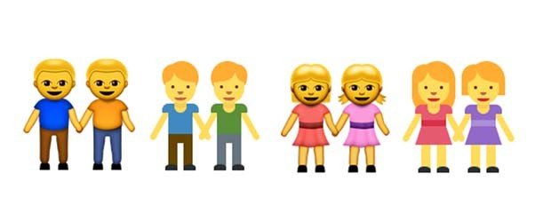Estes emojis representam casais do mesmo sexo de mãos dadas e a bandeira do arco-íris, utilizada normalmente para simbolizar a comunidade LGBT, e se encontram disponíveis nos aplicativos LINE e Whatsapp, assim como nas redes sociais Facebook e Twitter.