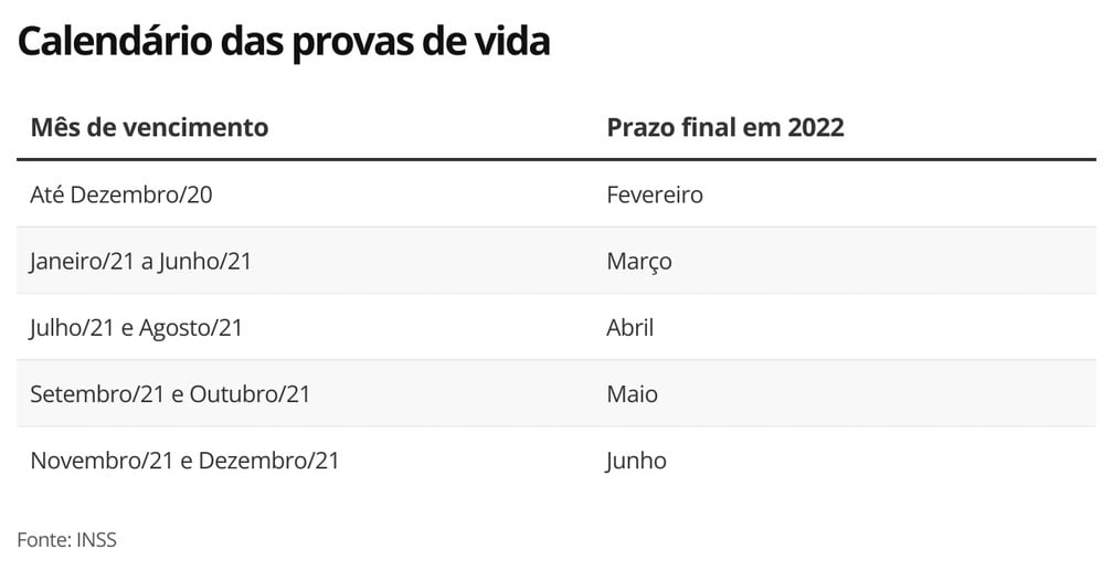 Agora, quem não comprovou até dezembro de 2020, por exemplo, terá que fazer o procedimento até fevereiro de 2022 para não ter o benefício suspenso. Já quem tinha que provar que estava vivo entre janeiro e junho deste ano terá até março do ano que vem para fazer o procedimento.