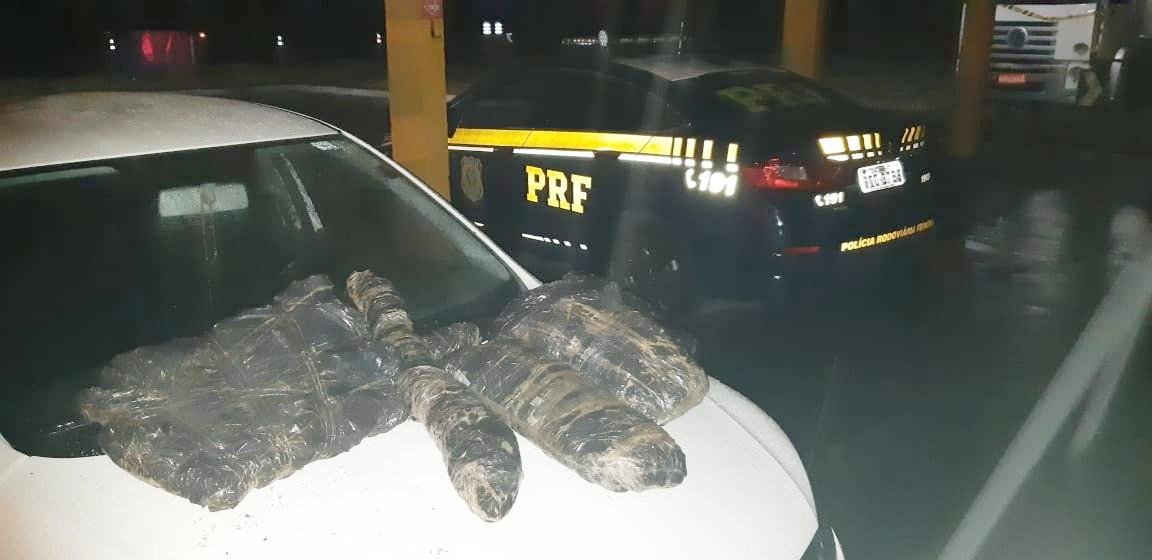 Uma fiscalização realizada na madrugada desta quarta-feira (02) resultou na apreensão de oito quilos de maconha, que eram transportados no para-choque de um carro.