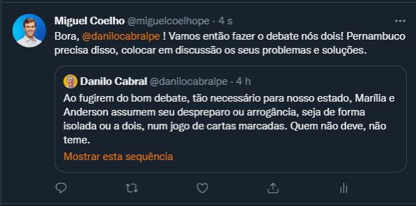 Após o aliado de Paulo Câmara criticar no Twitter a fuga de Marília Arraes e Anderson Ferreira do primeiro debate, o ex-prefeito de Petrolina respondeu na mesma rede social. “Bora, Danilo Cabral! Vamos então fazer o debate nós dois! Pernambuco precisa disso, colocar em discussão os seus problemas e soluções”, provocou Miguel.