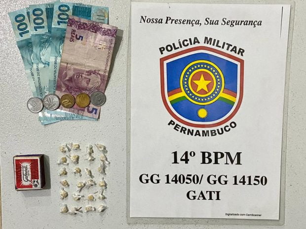Após realizar a abordagem, a PM encontrou um invólucro plástico contendo 24 (vinte e quatro) pedras de crack e R$ 305,85 (trezentos e cinco reais e oitenta e cinco centavos).