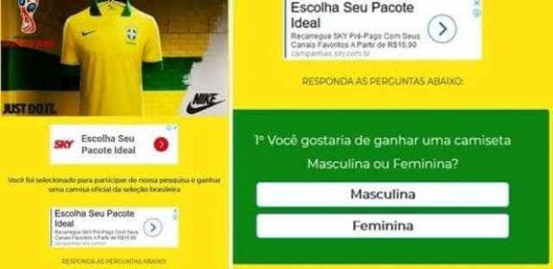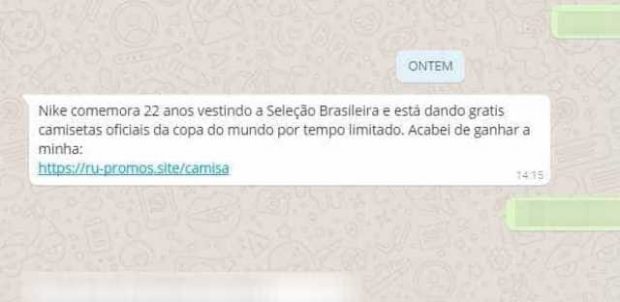 Por mensagem, cibercriminosos prometem o uniforme e pedem que os usuários acessem um link que não tem qualquer ligação com o site oficial da Nike. O portal induz que as vítimas respondam uma série de perguntas para ganhar a camisa. O problema é que o suposto presente nunca chega.
