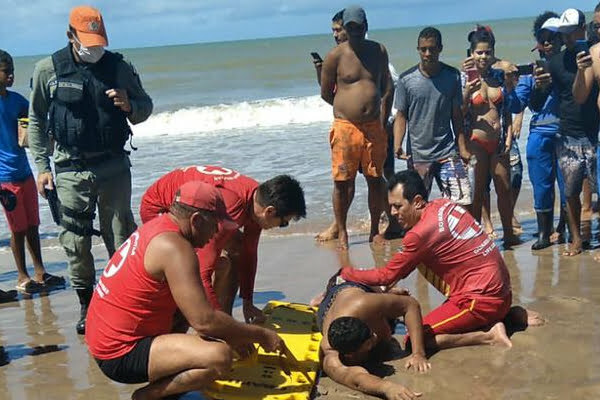 O banhista foi resgatado por equipes de salva-vidas que estavam no local com uma lesão na parte posterior da coxa esquerda e nos glúteos provocada pela mordida do tubarão.