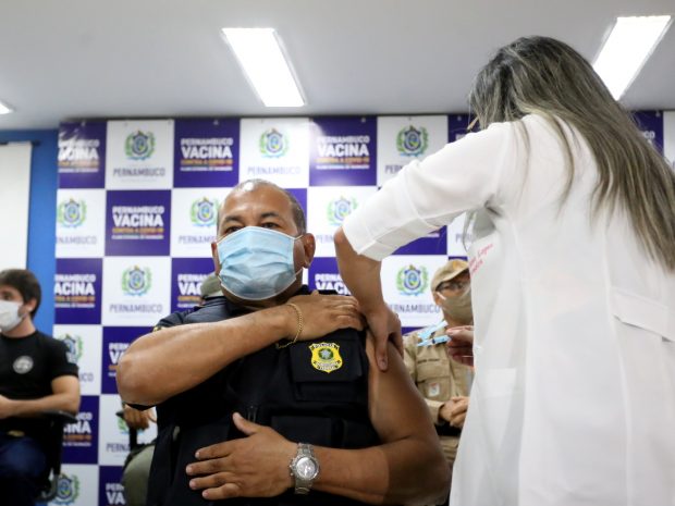Os profissionais da segurança pública que atuam em Pernambuco começaram a ser imunizados contra a Covid-19, nesta terça-feira (06), em ato simbólico realizado no auditório da Secretaria de Defesa Social (SDS), no bairro de Santo Amaro, no Recife. Neste primeiro momento, serão vacinados 1.692 servidores das forças vinculadas à SDS e outros 808 trabalhadores de órgãos federais, a exemplo das polícias Federal e Rodoviária Federal, além das Forças Armadas. No evento, um servidor de cada operativa foi imunizado.
