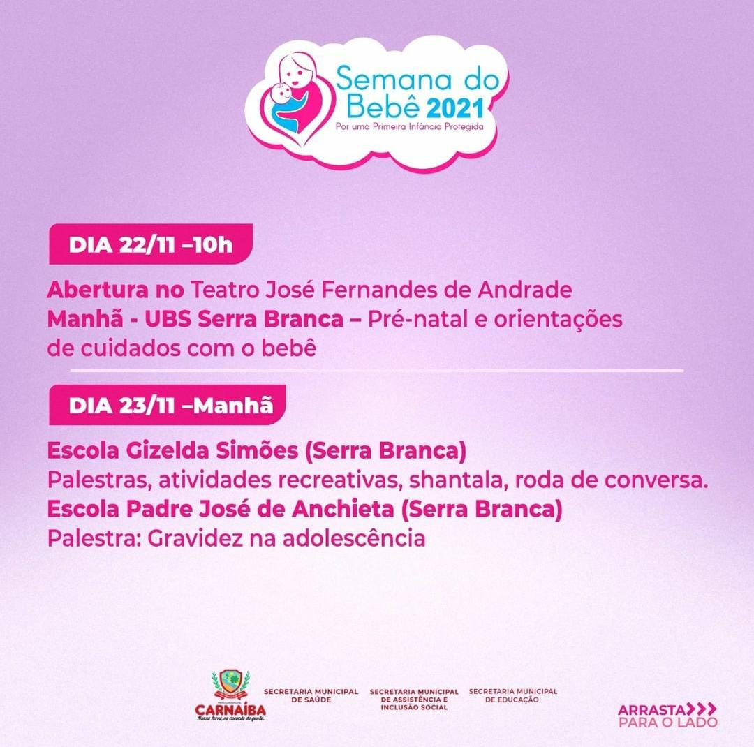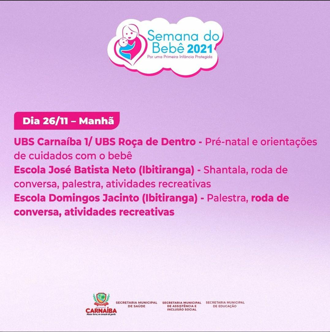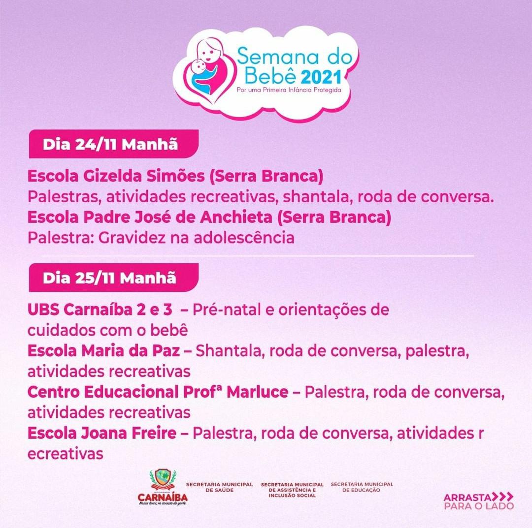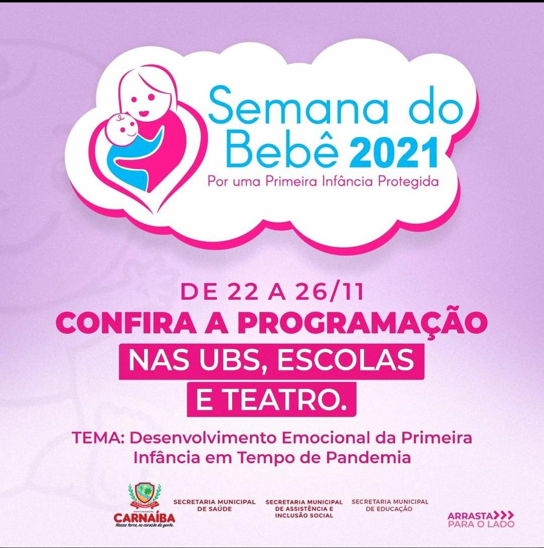 A Prefeitura de Carnaíba promove, dos dias 22 a 26/11, a Semana do Bebê, uma parceria das secretarias de Saúde, Assistência e Inclusão Social e Educação. A abertura acontece no dia 22, a partir das 10h, no Teatro Municipal José Fernandes, com a palestra-tema Desenvolvimento Emocional da Primeira Infância em Tempo de Pandemia e outras atividades.