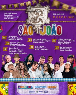 A festividade homenageia as mulheres, com o tema “Mirandibense, feminina, mulher arretada e sim sinhô”. Os principais nomes são Walkyria Santos, Avine Vinny e Mara Pavanelly.