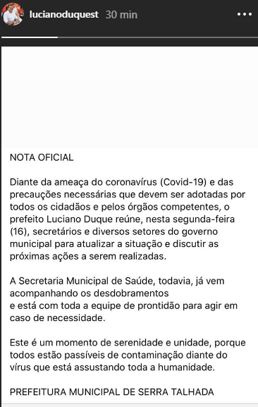 Nas redes sociais o Prefeito Luciano Duque escreveu que: “Diante da ameaça do coronavírus (Covid-19) e das precauções e pelos órgãos competentes, o prefeito Luciano Duque reúne, nesta segunda-feira (16), secretários e diversos setores do governo municipal para atualizar a situação e discutir as próximas ações a serem realizadas.