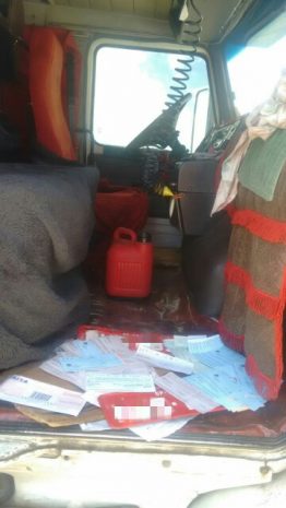 Após receber informações de que havia um caminhão abandonado em um posto de combustível no quilômetro 57 da rodovia, os policiais foram até o local e constataram que se tratava de um veículo roubado. Na cabine foram encontrados os cheques, duas placas de aluguel de um caminhão idêntico ao recuperado e uma Carteira Nacional de Habilitação (CNH) com indícios de falsificação.