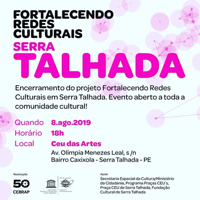 Acontece na próxima quinta-feira (08), no CEU das Artes, na Caxixola, a partir das 18h, o encerramento do Projeto Fortalecendo Redes Culturais em Serra Talhada. Realizado pelo Centro Brasileiro de Análise e Planejamento (CEBRAP), em parceria com a Organização das Nações Unidas para a Educação, a Ciência e a Cultura (UNESCO), o projeto está sendo desenvolvido em 4 cidades brasileiras: Embu das Artes (SP), Toledo (PR), Macapá (AP) e Serra Talhada (PE), única cidade do Nordeste selecionada para receber as atividades.