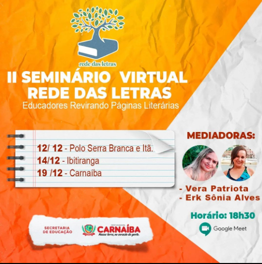 O projeto Rede das Letras realizado em Carnaíba, no Sertão do Pajeú, promove seu II Seminário Virtual, nos dias 12, 14 e 19 de dezembro, com o tema “Educadores revirando páginas literárias”.