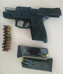 A Polícia conseguiu localizar uma PT G2c 9mm número de série em baixo do banco traseiro do veículo. Também foram encontrados um carregador de reserva com o total de 9 munições intactas e mais 9 munições na Pistola, um total de 18 munições.