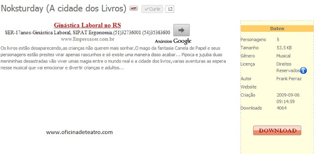 Como podem ver a obra possui 4.064 downloads até a data de hoje no maior site da internet na finalidade teatro, isso motiva o criador que apesar de não contar com apoio nenhum da Secretaria de Cultura local, sente-se motivado por ter outros grupos como CDP para incentivo o lado artístico do jovem autor que trabalha diariamente em projetos culturais como forma de lazer, pois a cidade só valoriza artistas de fora e dançarinos.