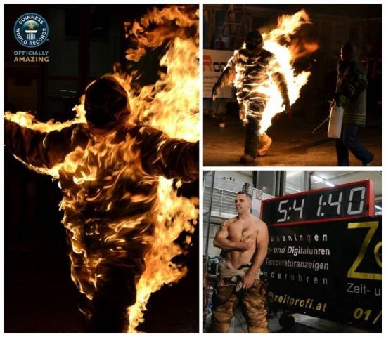 O austríaco Joe Tödtling, de 33 anos, virou uma verdadeira tocha humana, sem receber nenhum oxigênio, por 5 minutos e 41 segundos, quebrando um novo recorde mundial.
