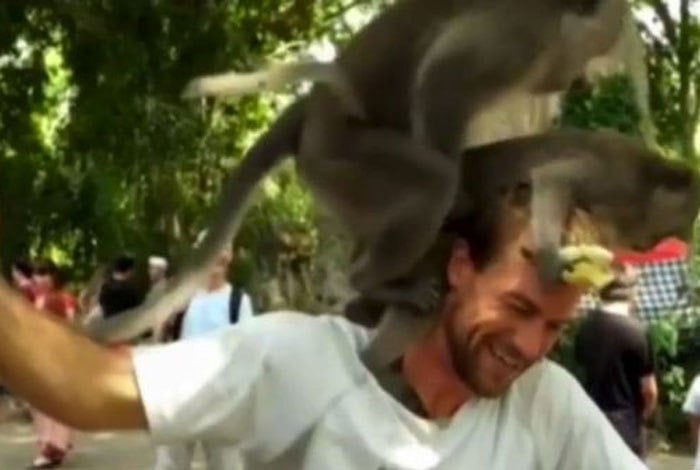 Um vídeo que mostra um turista norte-americano visitando um santuário em Ubud, na Indonésia, viralizou por uma interação naturalmente desinibida de um casal de macacos em cima dele. Os símios pularam em cima do rapaz, não identificado, e começaram a fazer sexo agarrados à sua cabeça.
